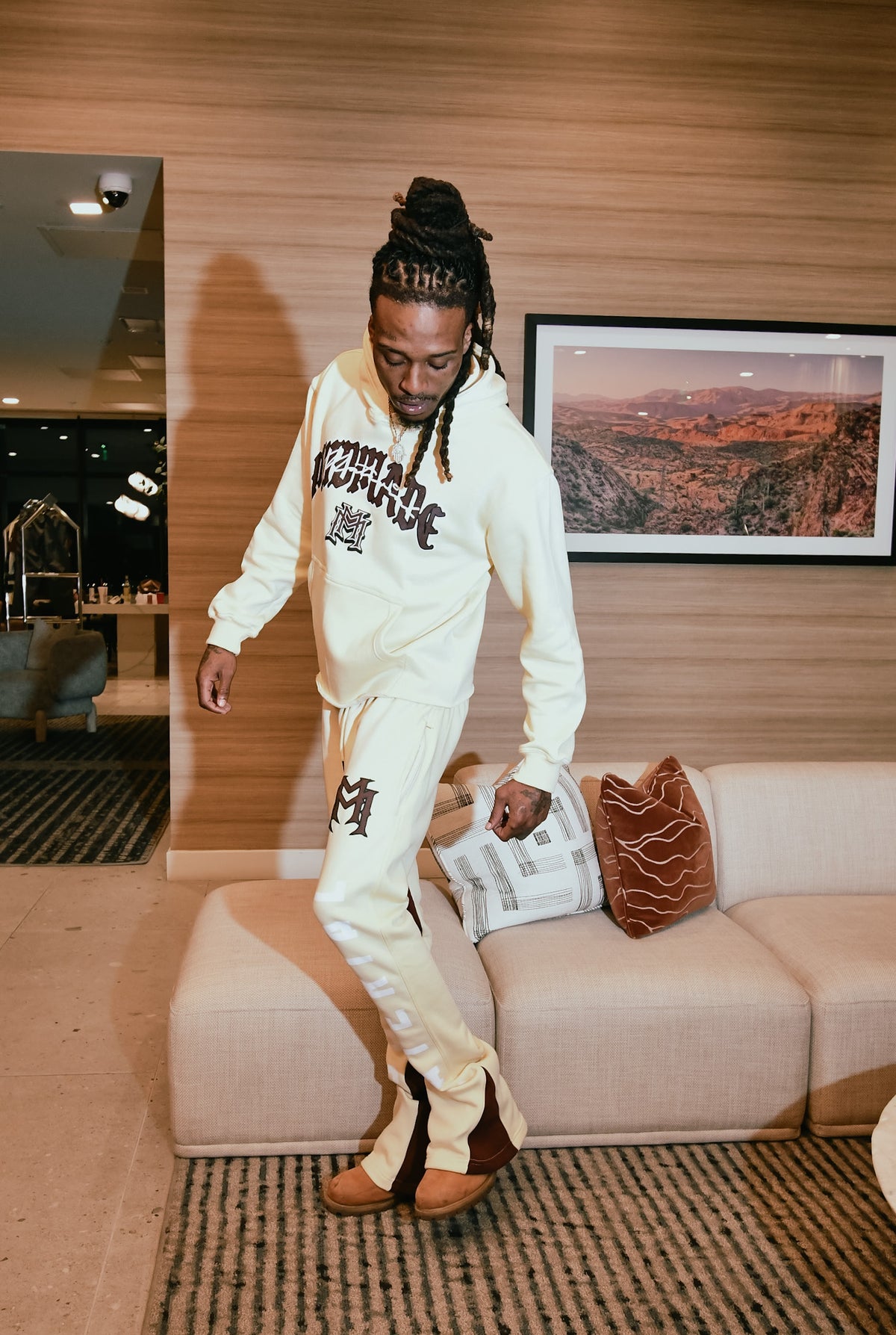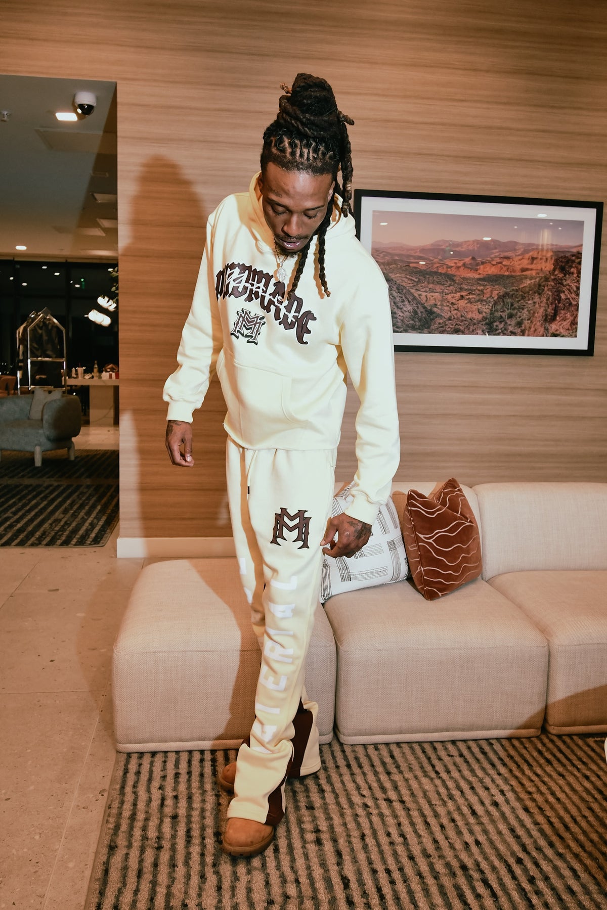 The sweatsuit is 100% cotton also with the double M’s puffed printed on the sweatsuit Own your style with the MudMade Premium Sweatsuit, where comfort meets confidence. This cream-colored hoodie and jogger combo delivers effortless streetwear appeal — perfect for travel, gym days, or casual city strolls.